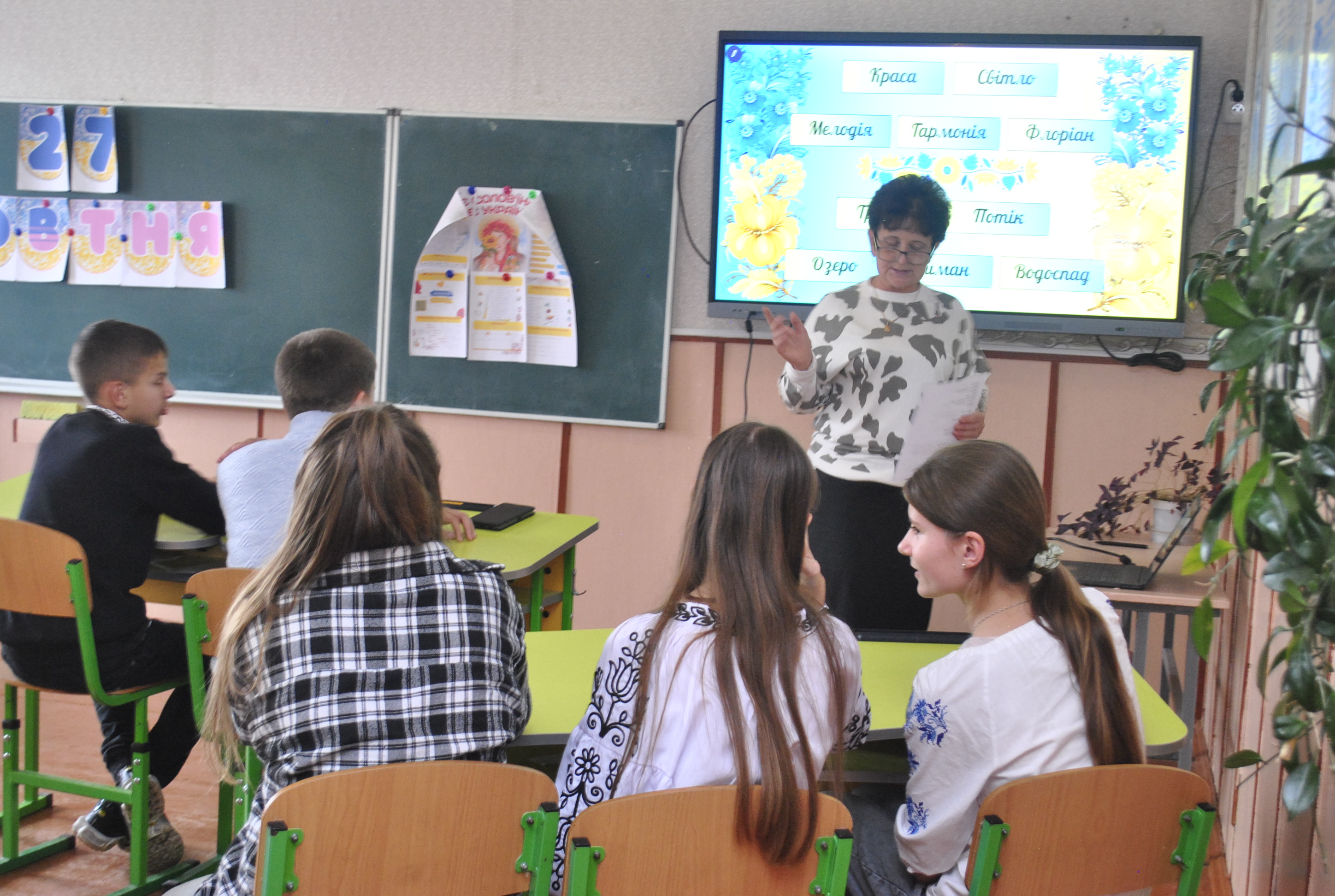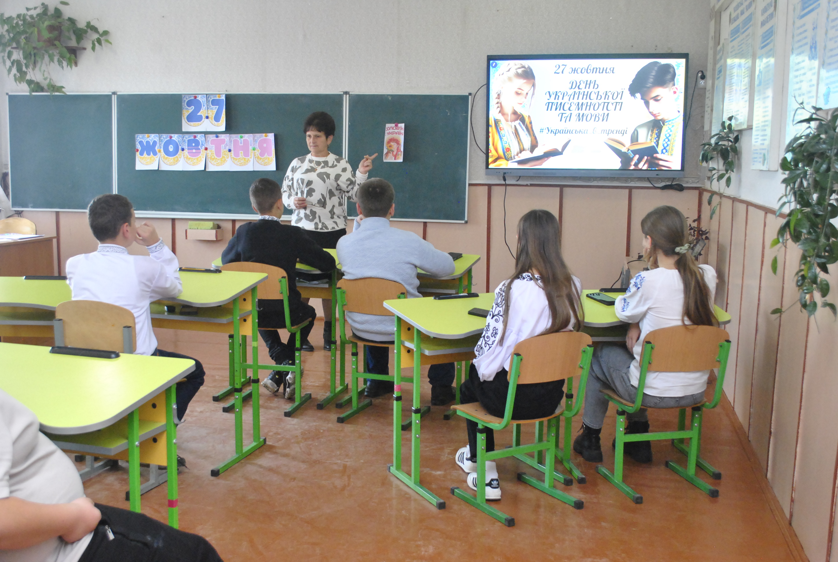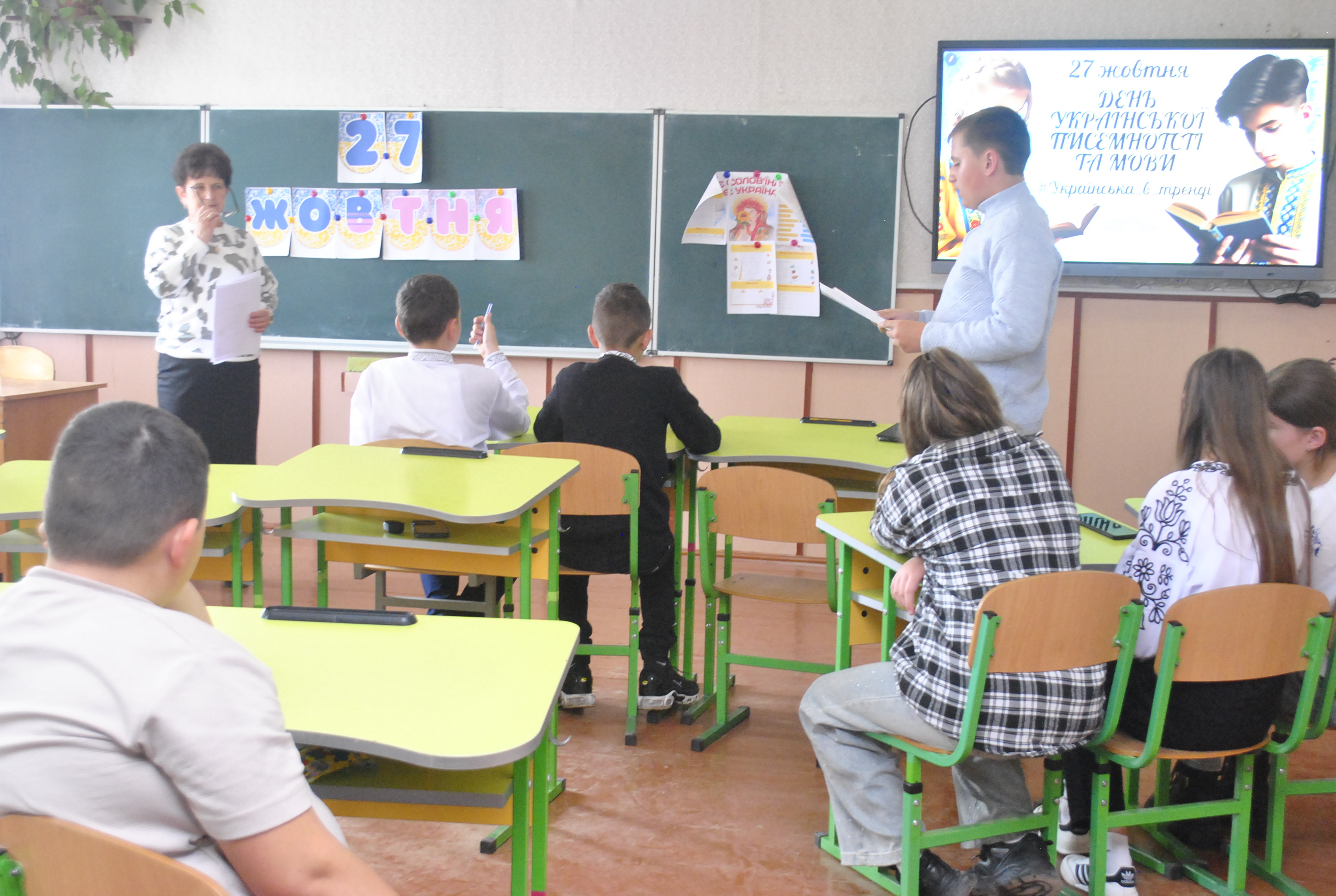 Учні 8,9 класів взяли участь у пізнавальній грі «Українська в тренді» , де змагалися у правильності виконання завдань з лексики й орфоепії. Ділилися своїми знаннями з фразеології, а також звучали вірші у виконанні восьмикласників. Учитель української мови й літератури Марія Сайчук розповіла цікавинки про витоки походження писемності, що сягають сивої давнини. Підсумувавши, учитель сказала, що українська мова — це не просто засіб спілкування. Це — наша пам’ять, наша пісня, наша сила.