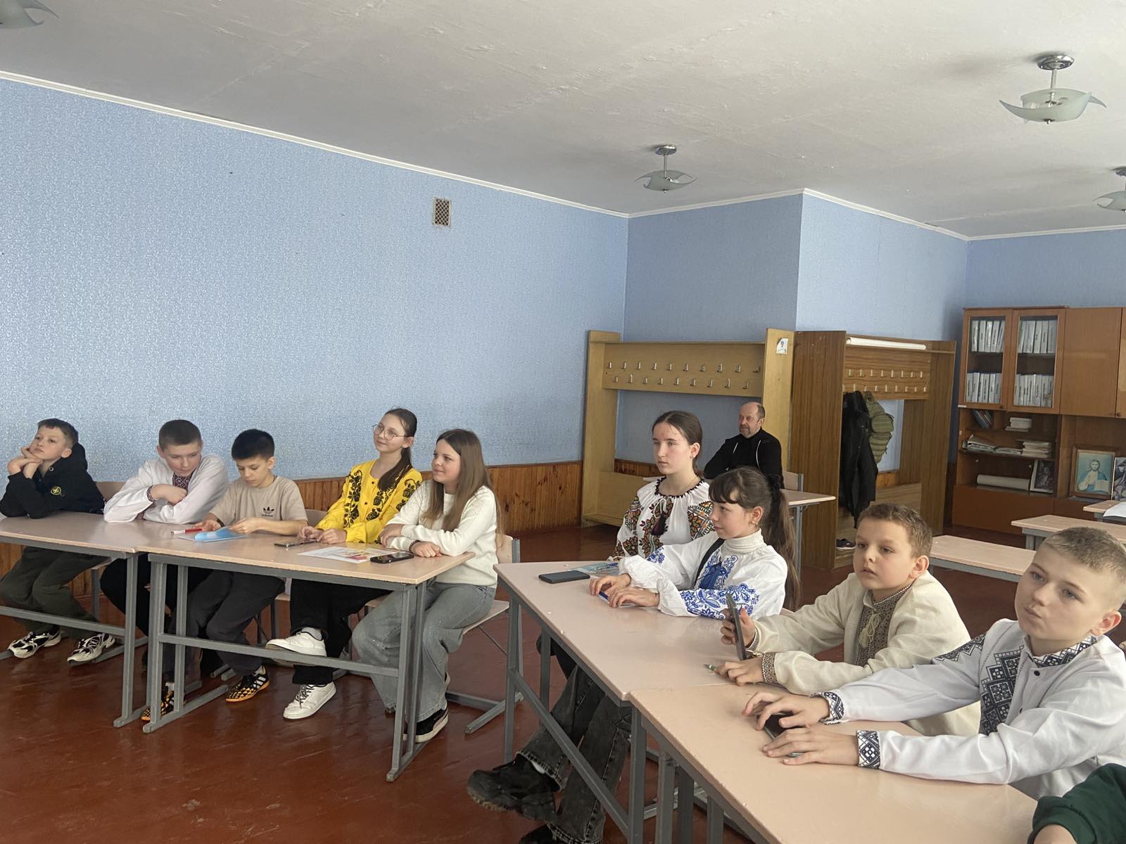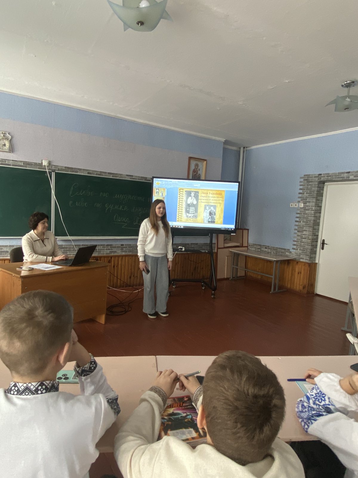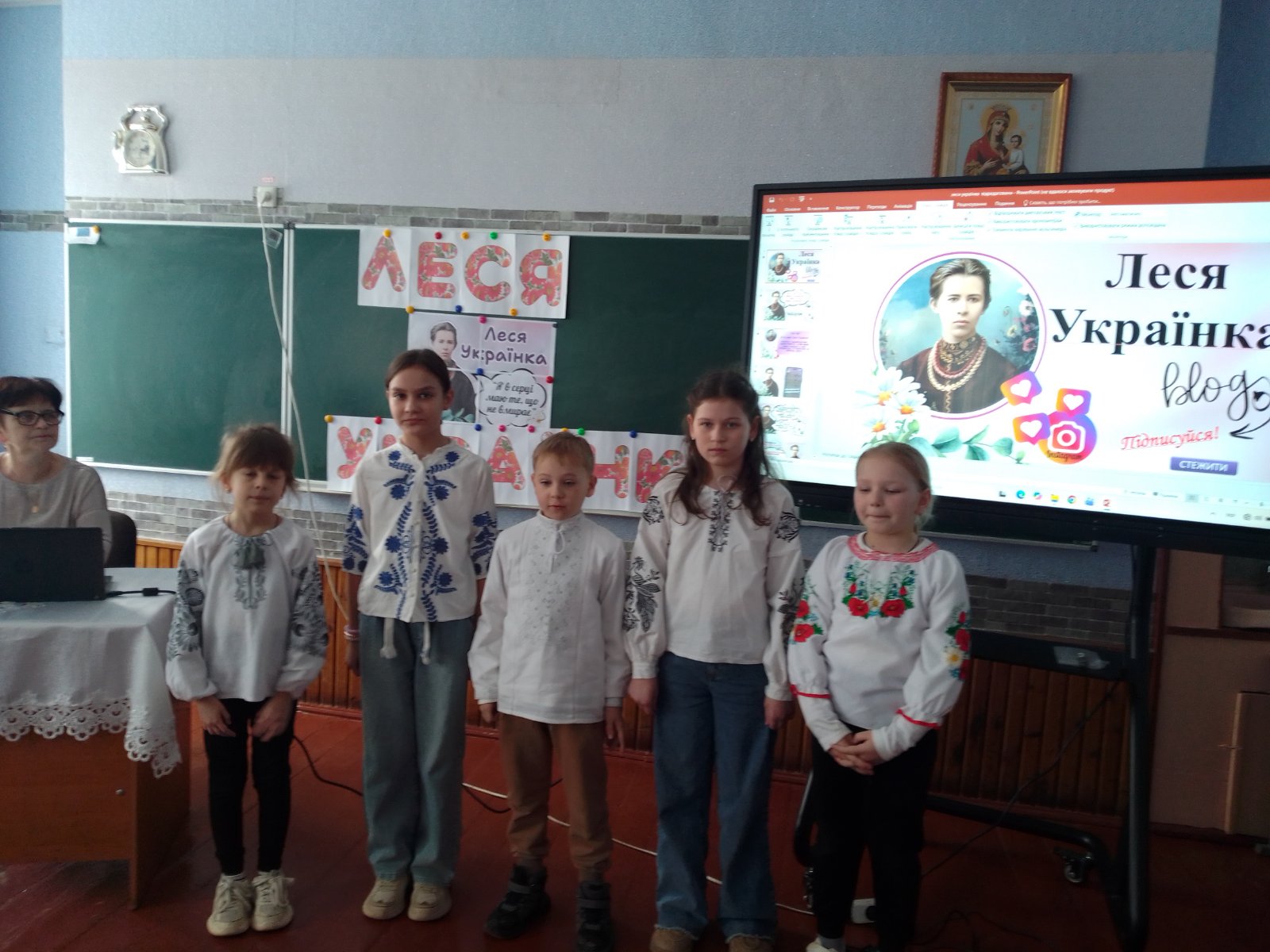 Марія Сайчук, учителька української мови і літератури, запропонувала учням 5 класу взяти участь у грі «Мовне гроно». П’ятикласники активно відповідали на запитання, а також декламували вірші. Учні 8, 9 класів долучилися до гри - презентації «Українка: Код незламності», яка спонукала їх до висловлювання думок, міркувань. Учениця 9 класу Христина Цьора щемливо продекламувала вірш «Без надії сподіваюсь».